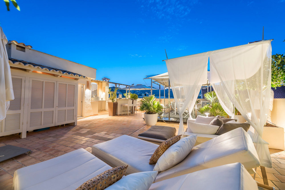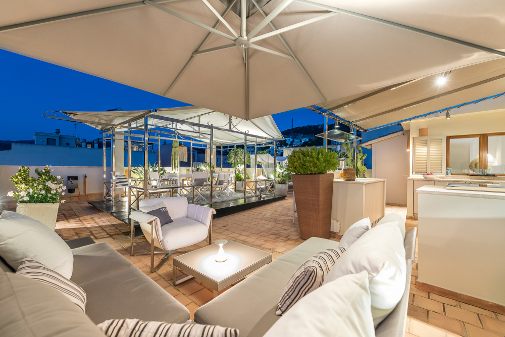 Dieses moderne Penthouse besticht durch modernes, aber mediterranes Design und Privatsphäre in einem der begehrtesten Häfen Mallorcas. Auf einer Gesamtfläche von 223m2 verteilen sich ein Schlafzimmer mit Badezimmer, ein Büro mit einem weiteren Badezimmer welches als zweites Schlafzimmer genutzt werden kann, ein großzügiger offener Wohnbereich und eine private Dachterrasse mit Außenküche. Weitere Ausstattungsmerkmale sind eine Klimaanlage, ein begehbarer Kleiderschrank, ein Kamin, eine Birgit-Müller-Küche sowie eine große private Dachterrasse, die das ganze Jahr über viel Sonne bietet. Alle Annehmlichkeiten sind zu Fuß erreichbar.