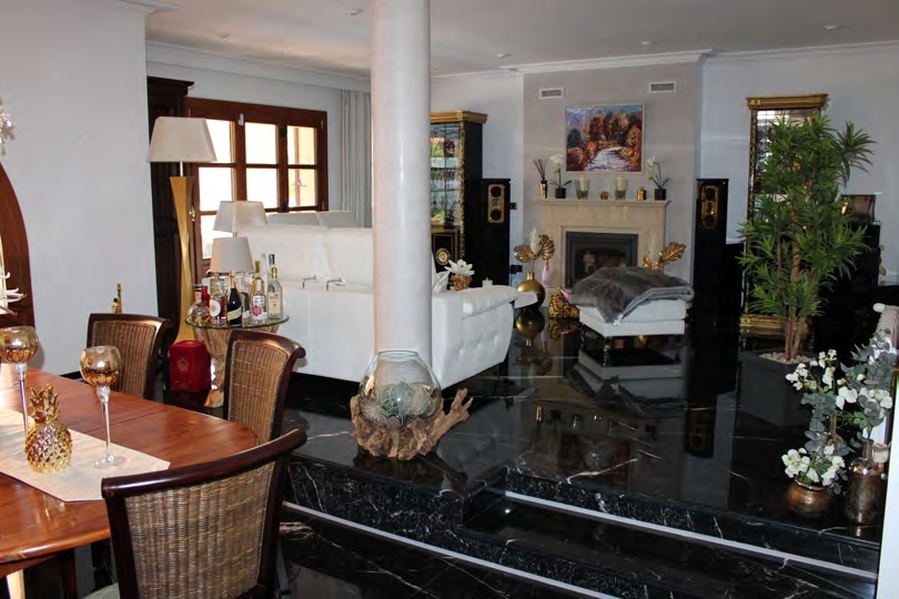 Das Ess- und Wohnzimmer sind komplett mit schwarzen Marmor Fußboden ausgestattet. Es ist dort ein ein sehr werthaltiger Kamin eingebaut. Vom Wohnzimmer haben sie direkten Zugang zur Lounge Terrasse. Über eine exklusive Steinway – Musikanlage können Sie wunderbar im Wohnzimmer relaxen.