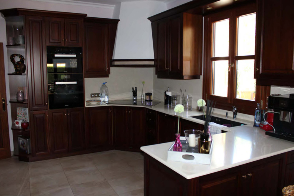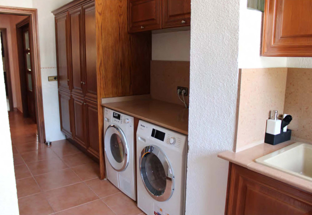 Die voll ausgestattete Küche mit Miele – Elektrogeräte und Klimaanlage können Sie vom Flur oder vom Esszimmer betreten. Nach einem gemütlichen Frühstück gelangen Sie direkt aus der Küche auf die Hauptterrasse mit Zugang zum Garten und zum 12x 5 Meter großem Pool mit Außendusche. Neben dem Pool befindet sich noch ein Jacuzzi in dem Sie dann Abends die Seele baumeln lassen können.
