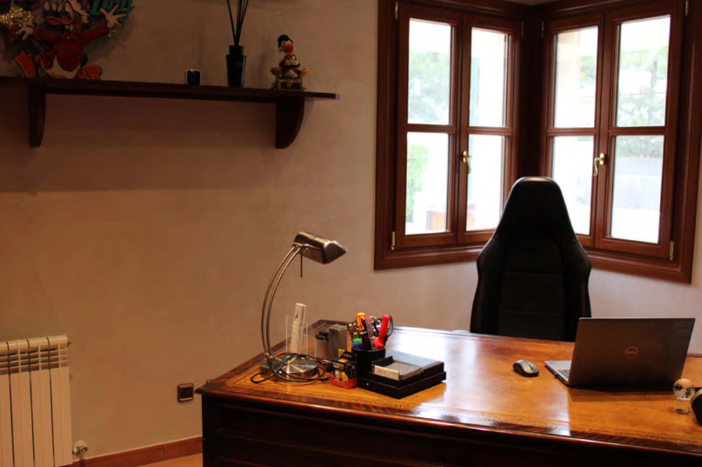 Aus dem Eingangsbereich gelangen Sie in das erste Büro mit Klimaanlage (kann selbstverständlich auch anders genutzt werden), daneben befindet sich das Gäste WC. Ebenfalls können Sie aus dem Eingangsbereich in die Garage gelangen. Diese verfügt über einem Stellplatz, auf der Auffahrt haben Sie weitere Parkmöglichkeiten.