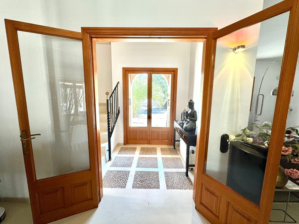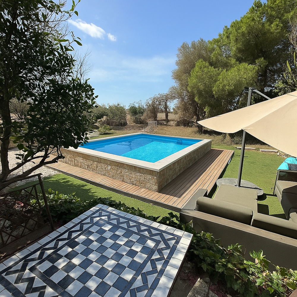 Der Außenbereich dieser außergewöhnlichen Finca ist ebenso beeindruckend. Eine großzügige Terrasse mit Outdoor-Lounge, Grillplatz und ein eingelassener Pool mit einem Durchmesser von fünf Metern bieten zahlreiche Möglichkeiten zur Entspannung und Unterhaltung im mediterranen Klima. Ein neuer großer, halbversenkter Pool kann auf Wunsch realisiert werden. Ein entsprechender Kostenvoranschlag liegt bereits vor. Die Immobilie kann wahlweise mit oder ohne den neuen Pool übernommen werden – ganz nach Ihren Vorstellungen.