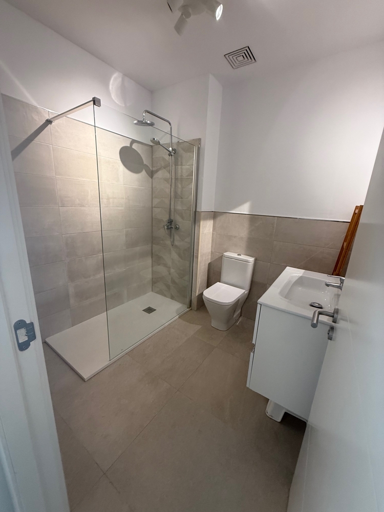 Großzügiges Wohnzimmer mit Zugang zur Terrasse, zwei Schlafzimmer, jeweils mit eigenem Bad (Dusche) und Klimaanlage (warm/kalt)