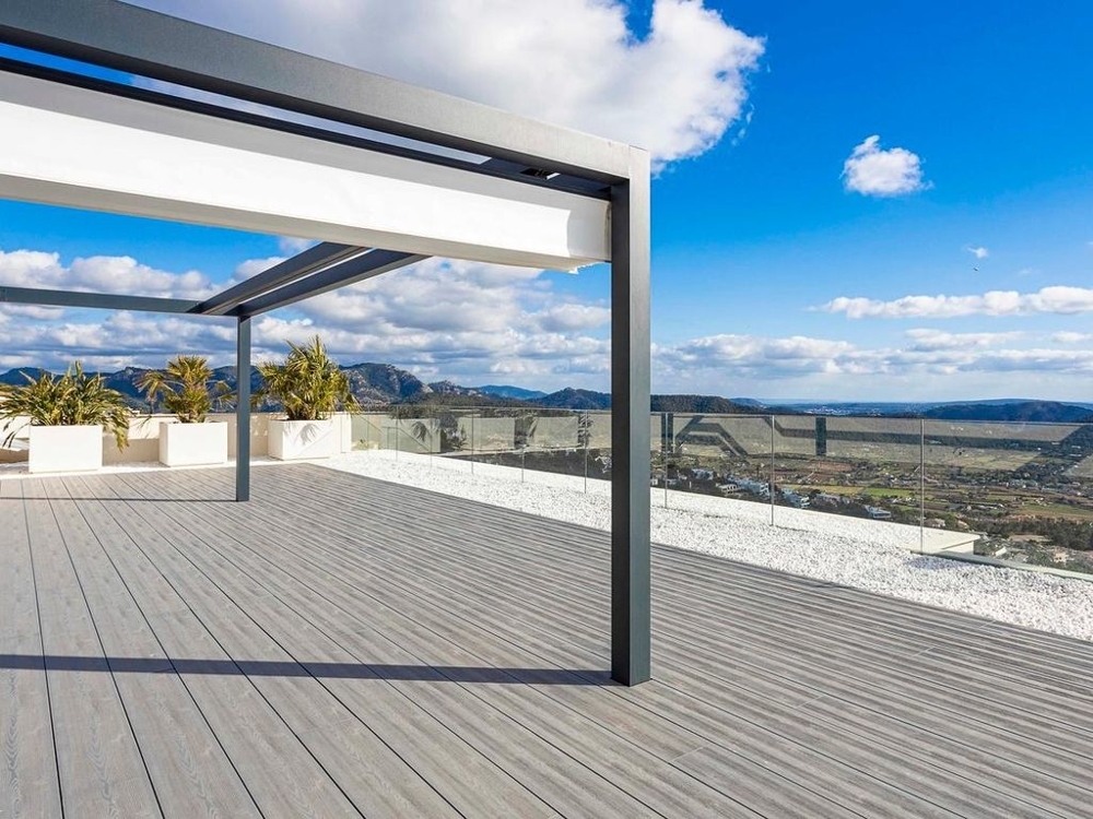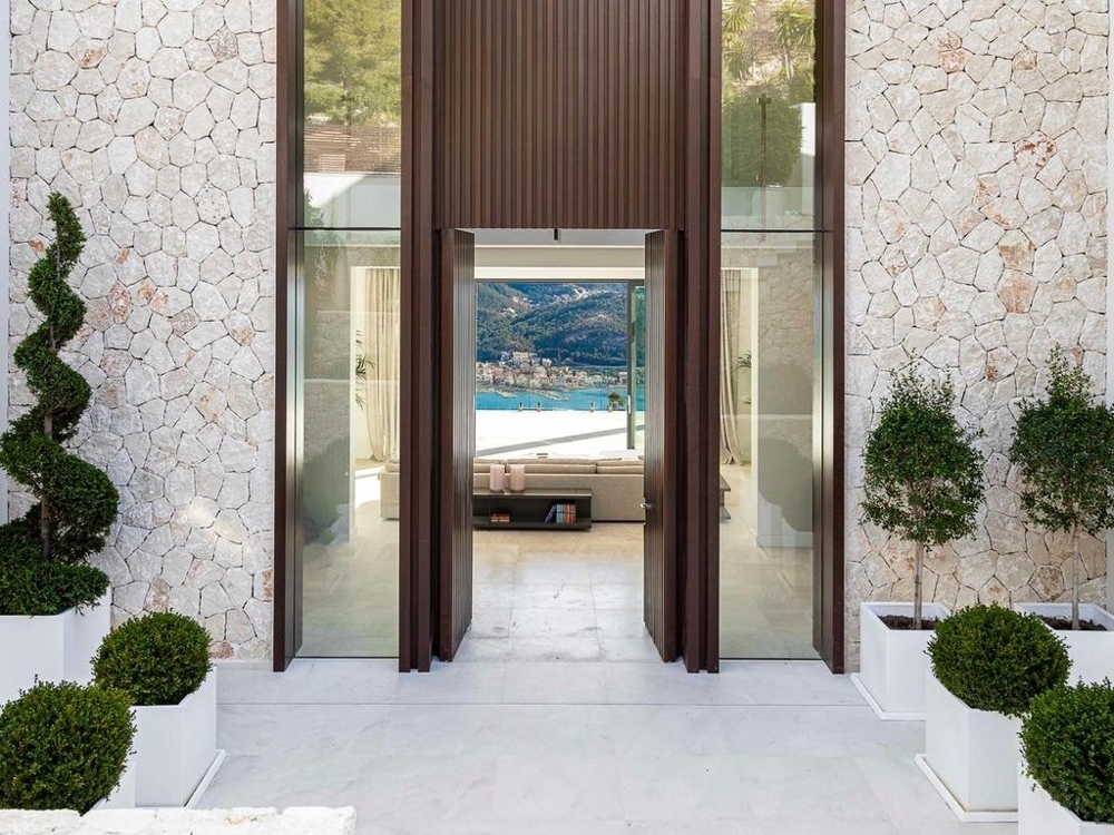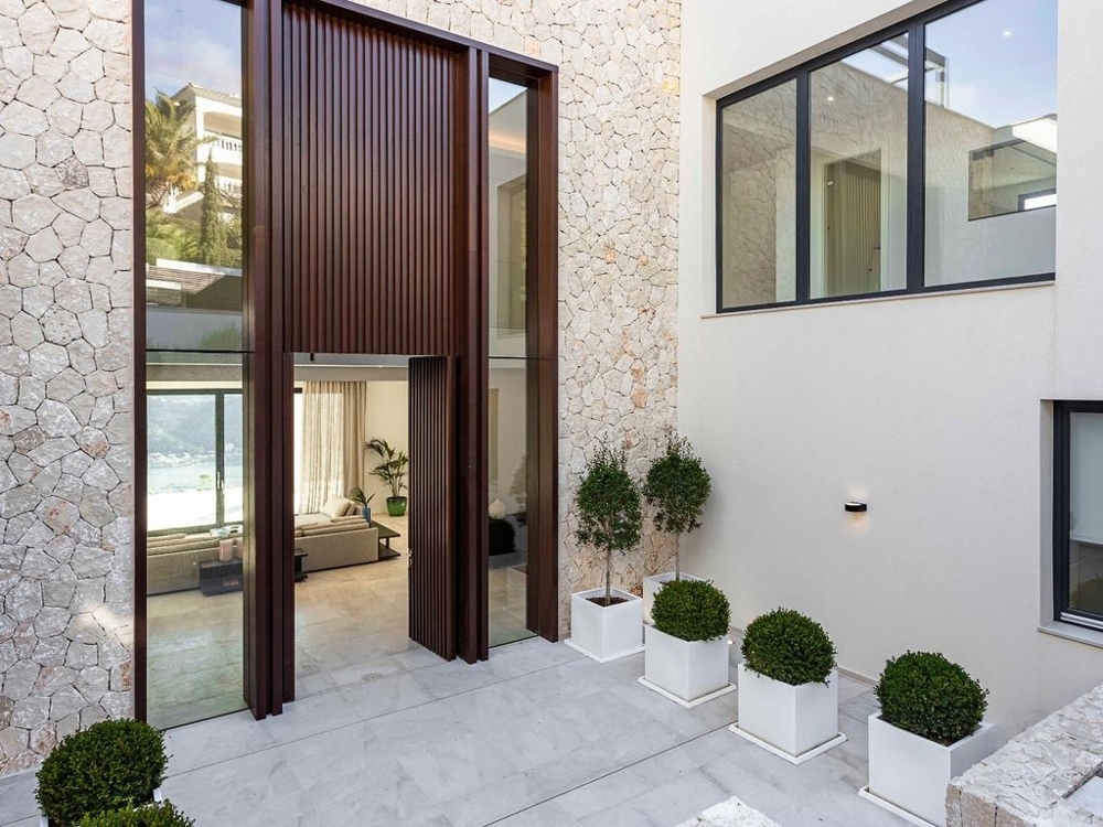 Südwestlage. Die Nettowohnfläche dieser Luxusvilla in Puerto Andratx/Monport beträgt 850 m² plus 600 m² Terrassen, die sich auf fünf Etagen verteilen. Das Erdgeschoss ist über eine breite Treppe zu erreichen, die durch einen schönen, blumengeschmückten Innenhof führt. Auch von hier aus können Sie durch die hohen Fenster zu beiden Seiten der großen Haustür einen Meerblick genießen.