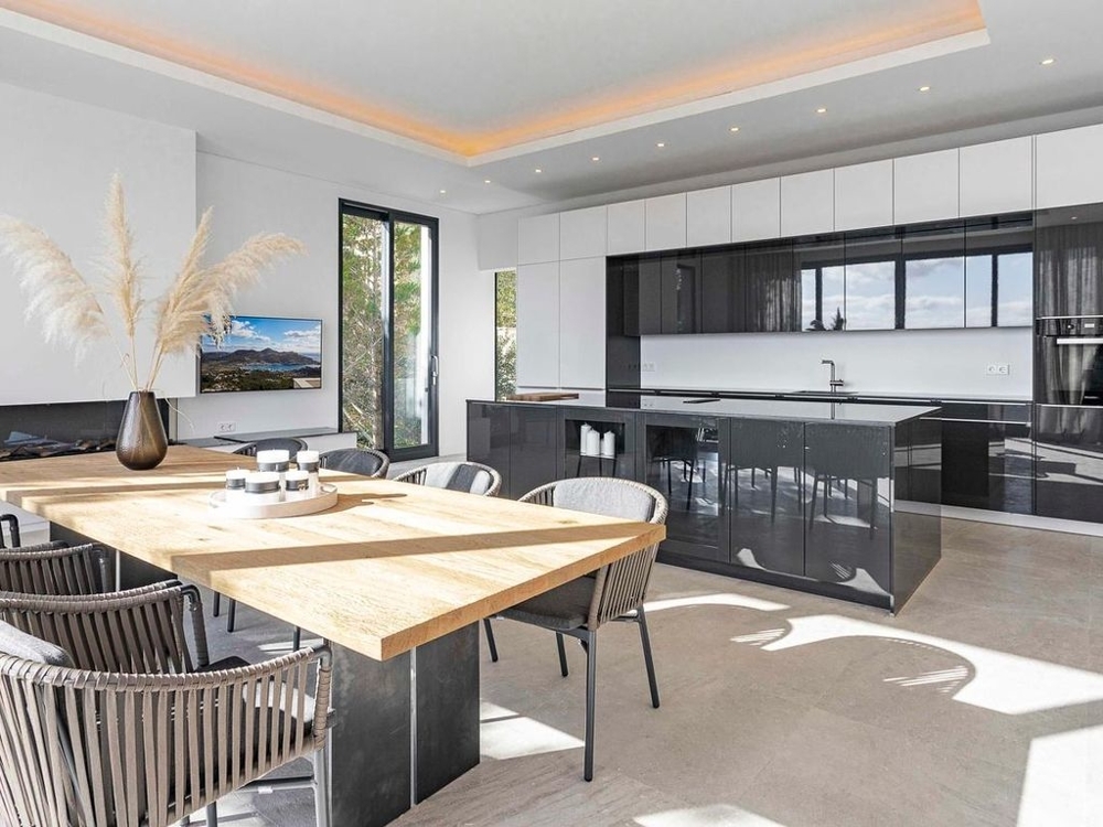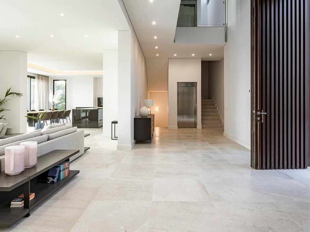 Durch diese Tür betritt man eine opulente, lichtdurchflutete und großzügige Eingangshalle mit einer acht Meter hohen Decke. Auf dieser Ebene befinden sich ein Fernsehzimmer, ein Wohnzimmer und ein großes Esszimmer mit offener, moderner Küche. Von allen drei Räumen haben Sie Zugang zur südseitigen, überdachten Terrasse von 180 m².