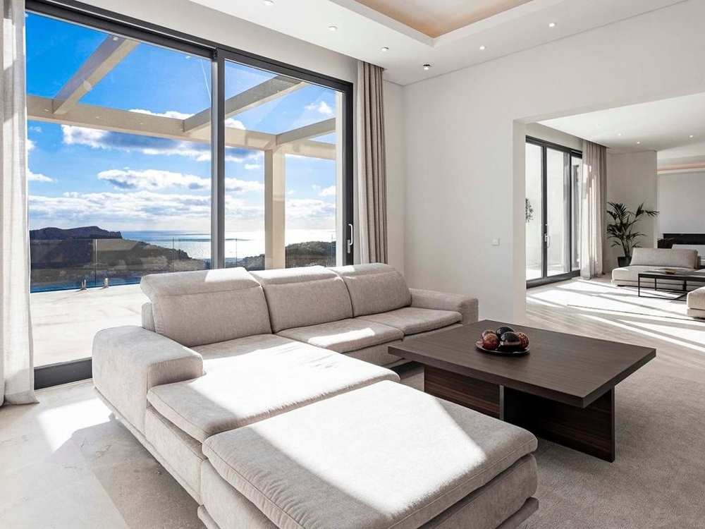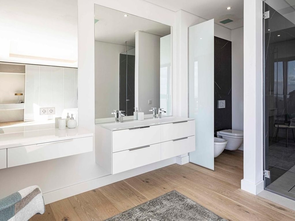 Zwei große Schlafzimmer mit jeweils eigenem Bad und eigener Terrasse vervollständigen das Erdgeschoss. Auf der ersten Etage befinden sich drei große Schlafzimmer mit Ankleidezimmern und en-suite Badezimmern. Alle Schlafzimmer bieten einen spektakulären, nach Süden ausgerichteten Meerblick. Diese Ebene befindet sich auf Straßenniveau und Sie finden hier die Garagen, jeweils mit Platz für zwei Autos und mit direktem Zugang zum Haus.
