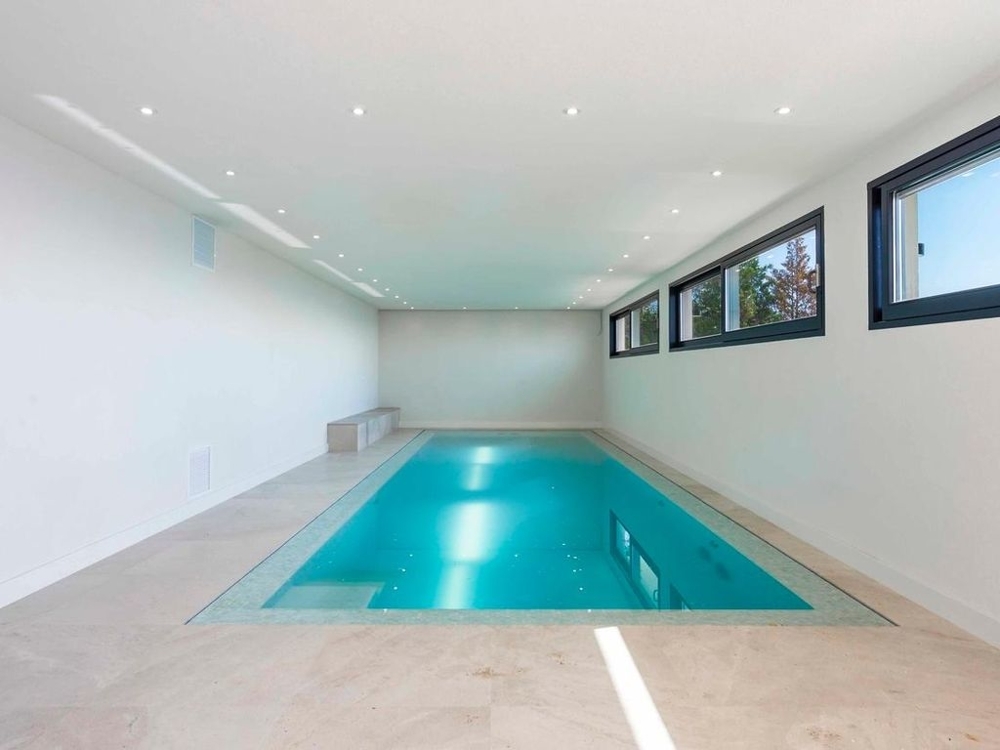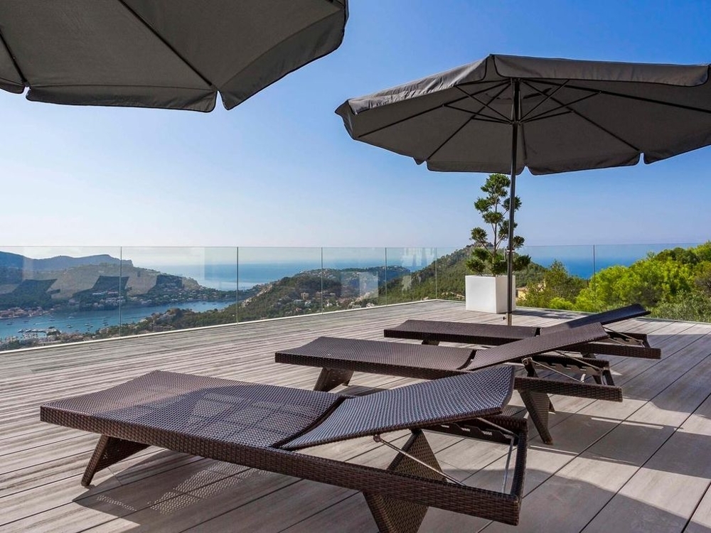 Ein Aufzug oder eine breite Innentreppe führt zu allen vier weiteren Ebenen der Villa. Durch das Erdgeschoss dieser Luxusvilla gelangen Sie auf die spektakuläre Außenterrasse mit dem 14x4 Meter großen Infinity-Pool und 100 m² Solarium mit 180º Panoramablick von Port Andratx bis Palma und Ibiza. Auf dieser Etage, im Inneren der Villa, befindet sich auch ein großzügiger Wellnessbereich mit 10 m Hallenbad, Fitnessbereich und Sauna und einem weiteren Schlafzimmer mit en-suite Badezimmer sowie Weinkeller, Lager- und Technikräume.